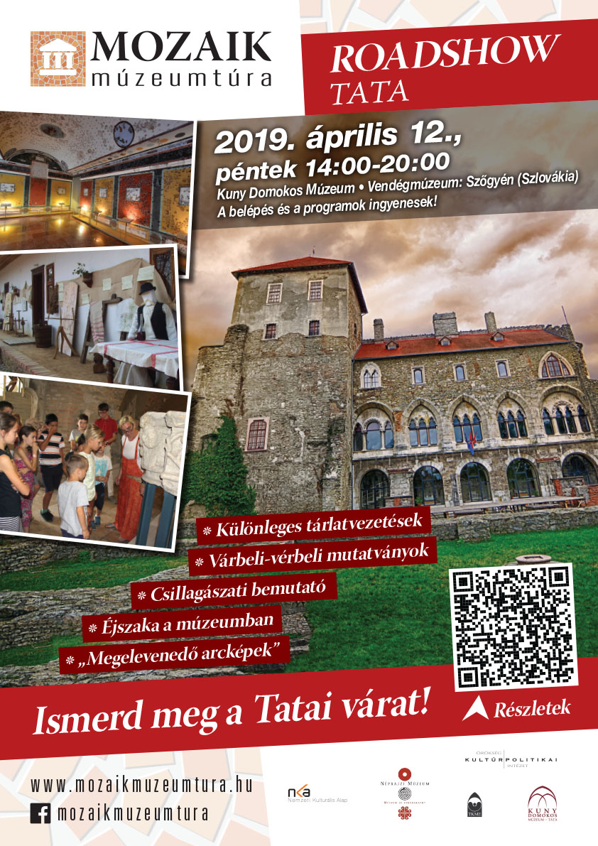A Roadshow tatai programjai a várban várják majd a múzeumbarátokat, ahol a 14. századi építménnyel és annak kiállításaival ismerkedhetnek meg rendhagyó, izgalmas módon a látogatók. A történelmi kalandozások már a délelőtt folyamán kezdetét veszik, igaz ekkor még csak az iskolák falai között: a Kuny Domokos Múzeum múzeumpedagógusai ugyanis 1-1 tanóra erejéig ellátogatnak Tata iskoláiba, ahol a középkor témájában tartanak foglalkozásokat a gyerekek számára. A várban délután veszi kezdetét a színes forgatag, ahol 14 órától ingyenes belépéssel és programokkal készülnek a szervezők. A Mozaik Múzeumtúra Roadshow tavalyi helyszínein is lehetősége adódott egy-egy határon túli múzeumnak, hogy hazai közönség előtt mutatkozhasson be, s ez idén sem lesz másképp: a vizek városába a felvidéki Szőgyén település múzeuma érkezik vendégkiállítással, amely kapcsolódik a rendezvény napján esedékes Felvidékről kitelepített magyarok emléknapjához.