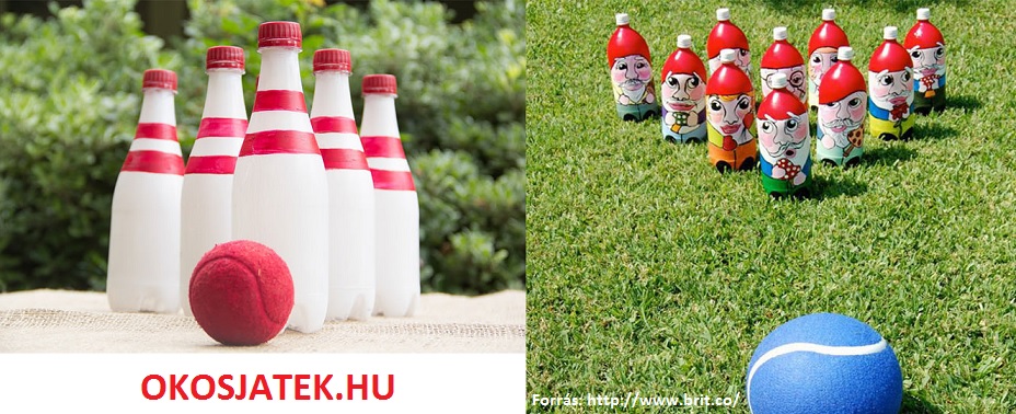 Hozzávalók: Üres műanyag flakonok, egy teniszlabda vagy labda. A flakonokat kidíszíthetjük egyszerűen festéssel vagy piros ragasztószalaggal, vagy ha jó a kézügyességünk, akkor ilyen kis törpéket vagy más komolyabb alkotást is készíthetünk a tekebábukra.