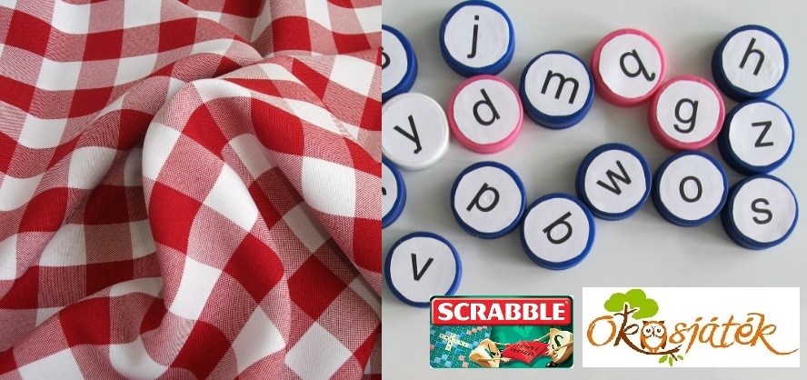 Hozzávalók: Kockás abrosz, vagy kockásra megrajzolt papír (a kockákba beleférjenek majd a betűk). Kupakok alkoholos filccel feliratozva, vagy a betűket ráragasztva.