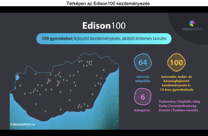 Idén először díjazták Magyarország legjobb, gyerekeket fejlesztő kezdeményezéseit. Az Edison100 listán összesen száz jelöltből 6+1 kategóriában kiosztott elismerést olyan szereplők érdemelték ki, akik innovatív és jövőbarát módon fejlesztik az általános iskolás korú gyermekek tudását és készségeit az iskolák falain túl.