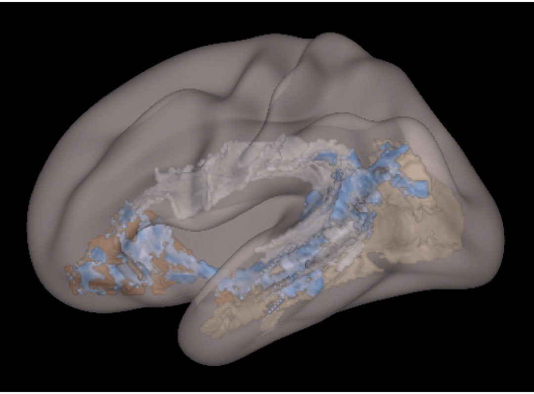 A tanulmány alábbi fotója kékkel mutatja, hogy az agy mely részeinek fehérállománya érintett.