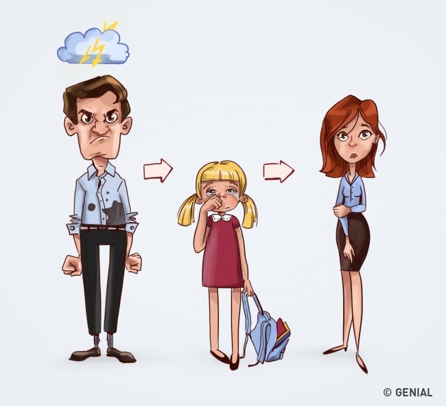 Reggelizik a család. A lányod ekkor véletlenül meglöki az asztalon a kávéscsészét, így a kávé ráömlik a tiszta fehér ingedre. Azonnal felpattansz és üvölteni kezdesz a gyerekkel, azt hajtogatod, hogy milyen kétbalkezes. Leszidod a feleségedet, amiért olyan közel rakta a csészét az asztal széléhez. A hálóba sietsz, hogy átöltözz, és amikor visszamész a konyhába, látod, hogy sír a lányod; nem fejezte be a reggelijét és nem készítette össze az iskolatáskáját sem.