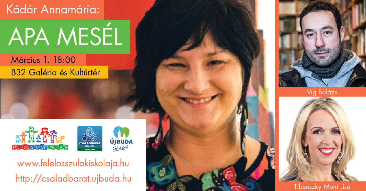 A sorozat második alkalmának címe Apa mesél, előadója Kádár Annamária meseterapeuta, aki március elsején arról fog beszélni, hogy az az élet- és családtörténetek hogyan járulnak hozzá az önbecsülés és a rugalmas alkalmazkodóképesség kialakulásához. Az előadást követő kerekasztal-beszélgetés vendége ezúttal Víg Balázs kortárs meseíró lesz.