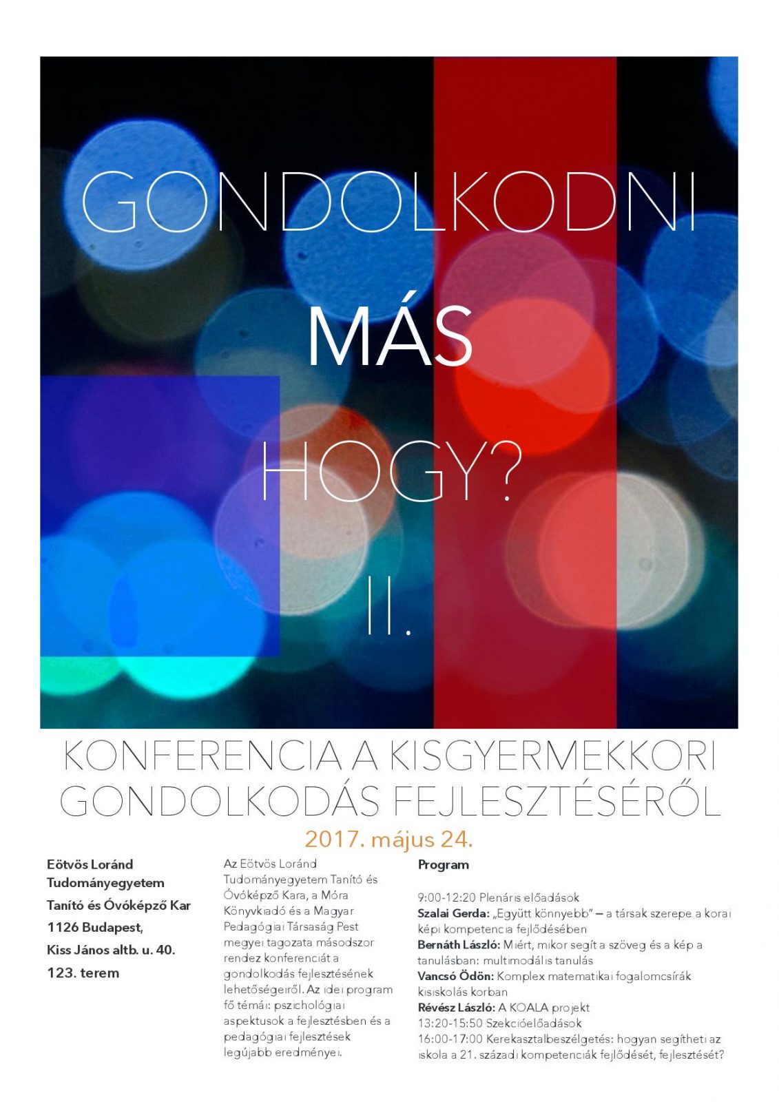 Az Eötvös Loránd Tudományegyetem Tanító és Óvóképző Kar, a Magyar Pedagógiai Társaság és a Móra Könyvkiadó immár második alkalommal rendezi meg a kisgyerekkori gondolkodás fejlesztéséről szóló, Gondolkodni-más-hogy? című konferenciát május 24-én.