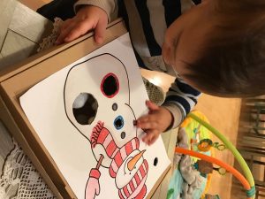 A dobozra ragaszd rá a kinyomtatott hóembert, és egy sniccer segítségével vágj kis lyukakat a dobozra!