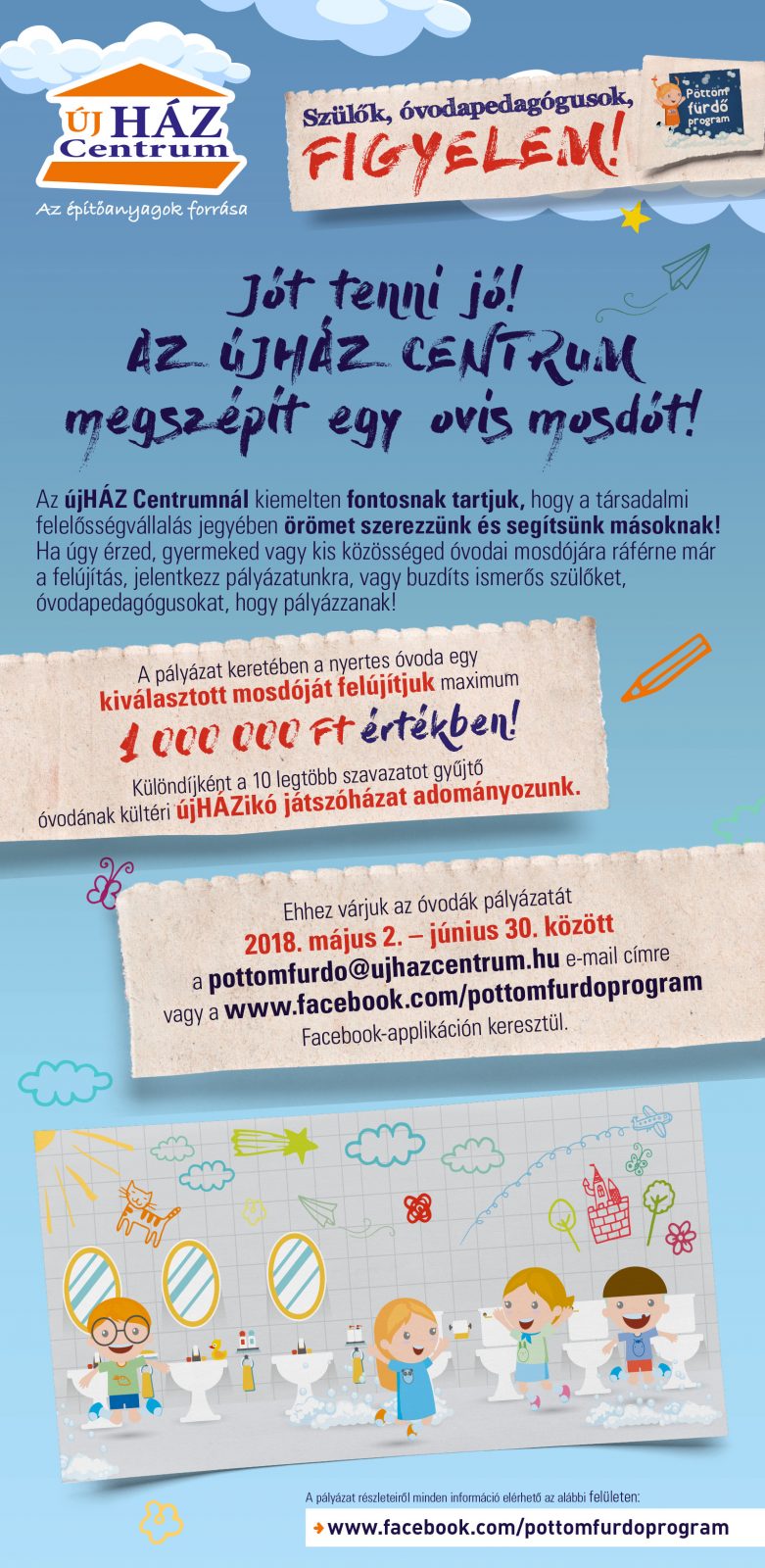 Az óvodák 2018 június 30-ig pályázhatnak, hogy elnyerjék az újHÁZ Centrum egymillió forintos támogatását. Az építőanyag-kereskedelmi hálózat az elmúlt évek alatt több ezer felépített és felújított otthon létrehozásában nyújtott szakértő segítséget. A társadalmi felelősségvállalás jegyében vállalt cél, hogy a gyerekek által megálmodott és lerajzolt mosdót megalkossa a vállalat.
