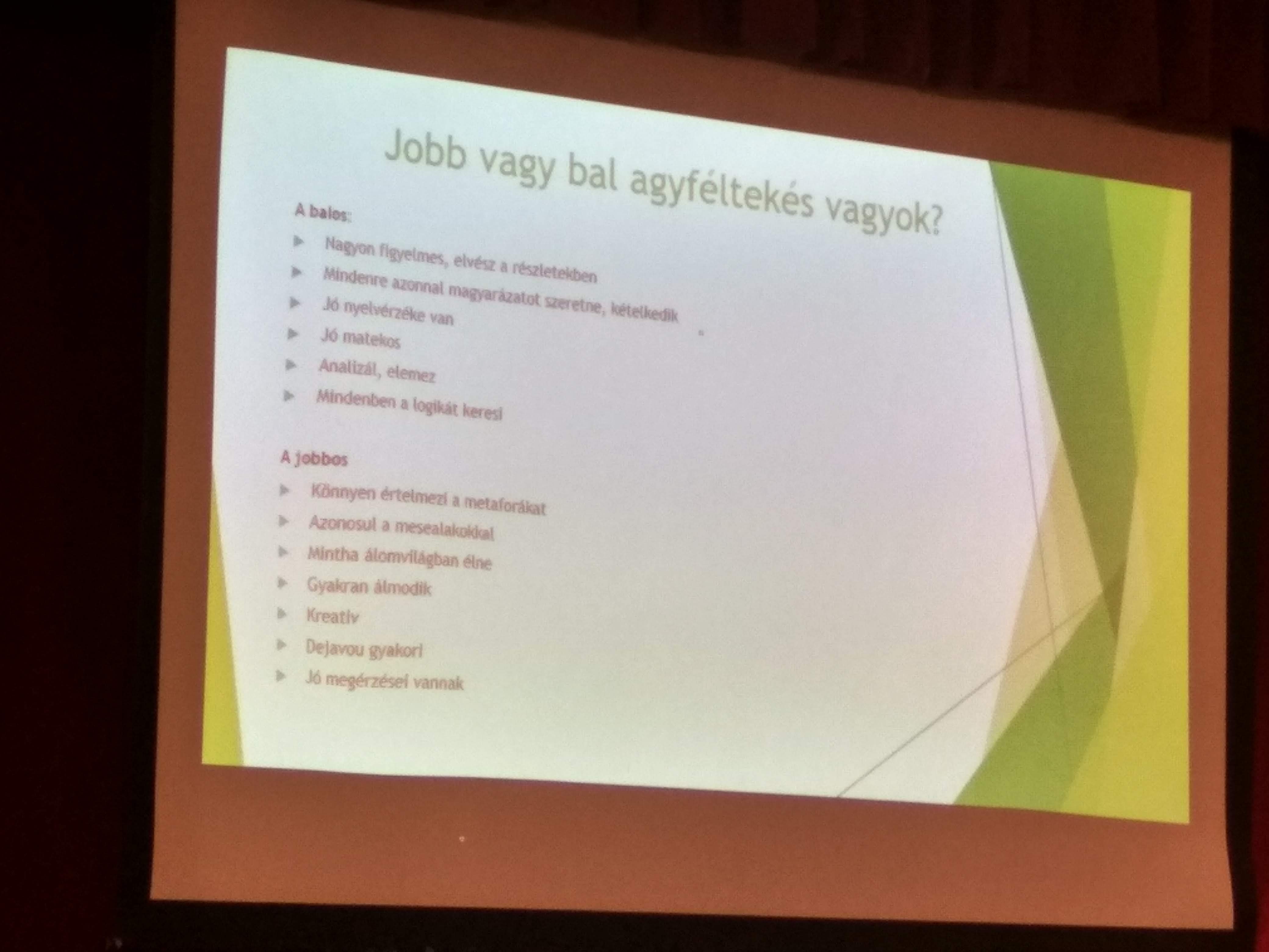 Rita a jobb és a bal agyféltekés gondolkodás és dominanciák bemutatásán túl az EGÉSZ-re figyelés, vagyis a jobb és a bal agyfélteke egyszerre használatának fontosságát hangsúlyozta.
