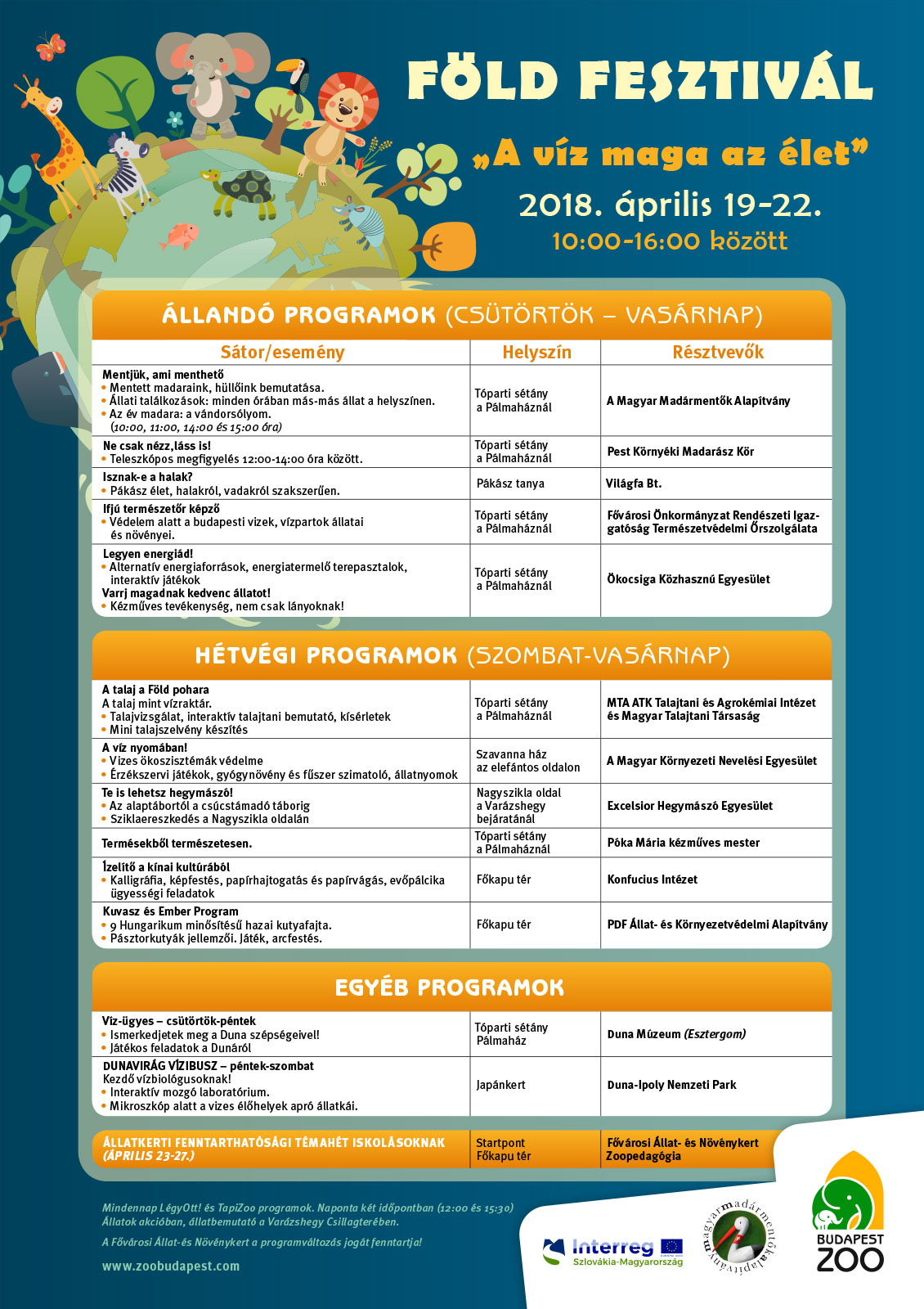 A két hétvégi napon, azaz szombaton és vasárnap a fenti programok továbbiakkal egészülnek ki. A Magyar Környezeti Nevelési Egyesület munkatársai a vizes ökoszisztémák védelmével kapcsolatos érdekességeket mutatnak be, a Talajtani és Agrokémiai Intézet, valamint a Magyar Talajtani Társaság sátránál pedig izgalmas kísérletekre, interaktív talajtani bemutatóra lehet számítani. Lesz a magyar kutyafajtákat bemutató program is. Az ELTE Konfuciusz Intézete ügyességi feladatokon, papírhajtogatáson, kalligráfia készítésén keresztül hozza el Kína kultúráját. Az Excelsior Hegymászó Egyesület jóvoltából pedig a sziklaereszkedést is ki lehet majd próbálni az állatkerti Nagyszikla oldalán.