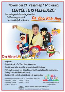 November 24-én, vasárnap a budakeszi Erkel Ferenc Művelődési Házban egész napos vidám, játékos, felfedező programokkal várják az egész családot. A Da Vinci TV csatorna népszerű, izgalmas ismeretterjesztő filmjeiből okulva sokat tanulhatunk a repülésről, az optikai illúziókról, a vulkánokról és a titokzatos reneszánsz ember, Leonardo Da Vinci életéről, találmányairól is.