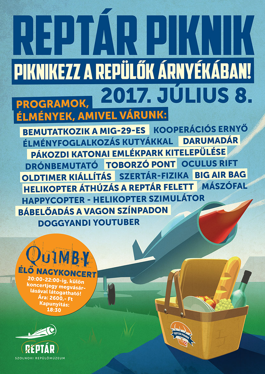 Ahogy a rendezvény nevében is benne van, bárki leterítheti lepedőjét a MiG-ek árnyékában, piknikezhet a kiállított repülők között. A RepTár Piknik reggel kilenctől 18 óráig várja látogatóit, este nyolckor a Quimby koncertje zárja a napot, erre már megvásárolhatók a jegyek a repülőmúzeum recepcióján.